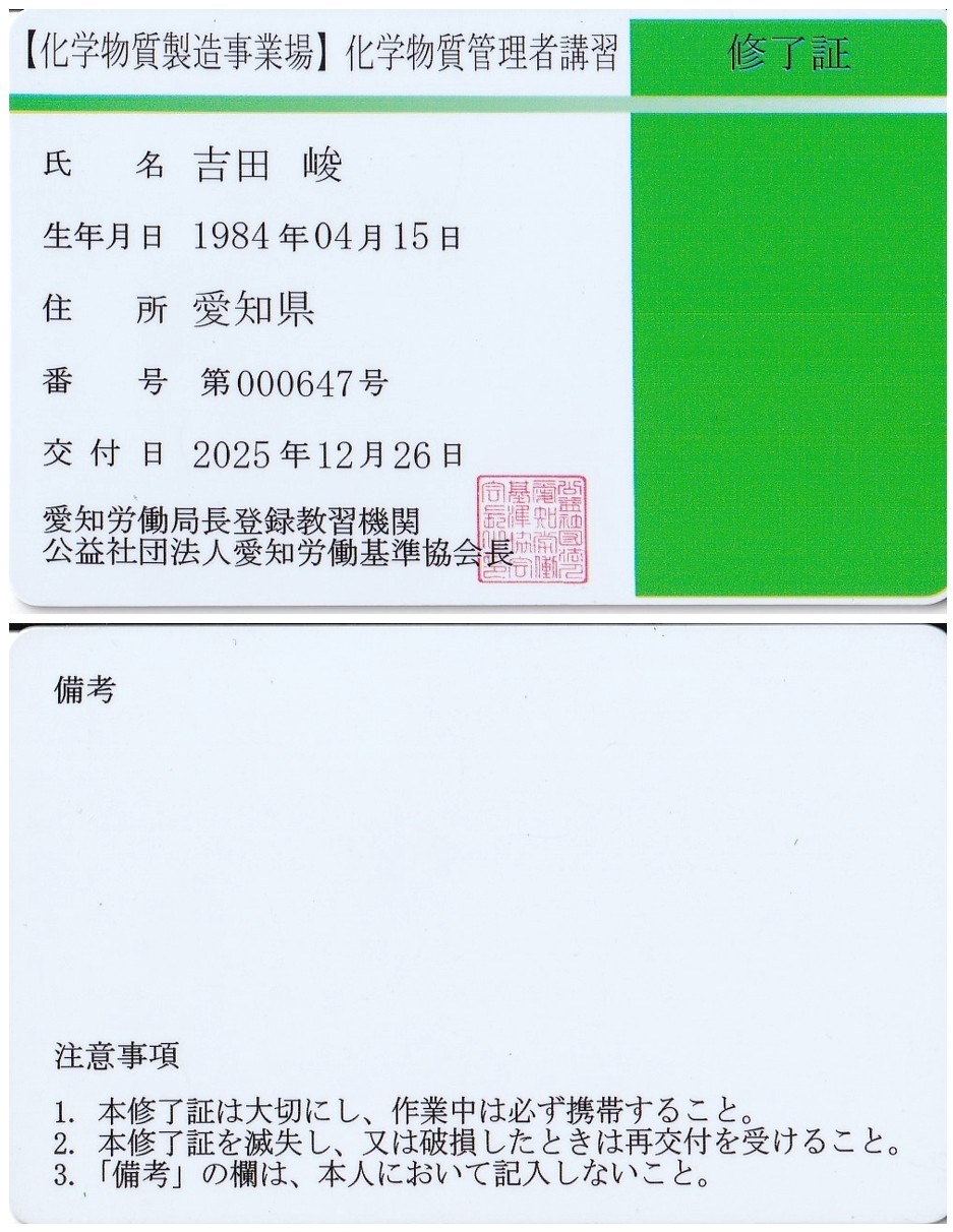 以下は、すべて私が実際に学び、現場で向き合い、必要に迫られて取得してきた資格です。 一つひとつに理由と背景があり、私の生き方そのものです。 掲載している資格写真につきましては、 原則として、免許証写真などの修正・加工は行わず、 できる限りそのままの状態で掲載しております。 それは、見た目を整えることよりも、 正確で分かりやすい情報を、誠実にお伝えしたい という思いを大切にしているからです。 また、上位資格を取得している場合には、 内容が重複する下位資格については、 一部省略して掲載しているものもございます。 必要な情報を必要な形でお伝えすること。 その姿勢を大切にしながら、 資格や知識の公開を行っています。 そしてこれらの資格は目的ではなく手段です。 現場で「本当に役立つこと」を届けるため、今も学び続けています。 1.生きる基盤を整えるために(Health & Life Skills) 食・健康・生活の基礎を整えることが、人生の安全と活力の土台になる。 ・調理師 ・製菓衛生師 ・栄養士 ・栄養士実力認定試験 A 認定 ・サプリメントアドバイザー ・ダイエットインストラクター ・登録販売者 ・チョコレートスペシャリスト ・日本蕎麦準学士 2.命と安全を守るための専門技術(Safety & Risk Management) 危険を見抜き、未然に防ぐために必要な現場の知識と技術を積み重ねてきました。 ・高圧ガス販売主任者(第一種販売主任者) ・危険物乙種第1~6類危険物取扱者 ・一般建築物石綿含有建材調査者 ・工作物石綿事前調査者 ・船舶石綿含有建材調査者 ・安全衛生推進者 ・安全管理者選任時研修修了 ・保護具着用管理責任者 ・騒音障害防止管理者 ・化学物質管理者(製造事業場) ・衛生工学衛生管理者 ・第一種衛生管理者 ・発破技士 ・特定第一種圧力容器取扱作業主任者 ・揚貨装置運転士 ・クレーン・デリック運転士(限定なし) ・移動式クレーン運転士 ・潜水士 労働安全衛生教育インストラクター資格 ・新CFT講座修了(建災防) ・RST講座修了(中災防) ・テールゲートリフターインストラクター(陸災防) ・テールゲートリフター講師(全登協) ・建築物石綿含有建材調査者講習インストラクター(中災防) ・熱中症予防労働衛生教育インストラクター(中災防) ・熱中症予防指導員・管理者講師(建災防) 3.職場と現場の安全を支える(OSHA系技能・教育) 現場で確実に安全を担保するために、手を動かし身体で学んできた資格群です。 労働安全衛生法による技能講習各種(統合カード) ・フォークリフト運転者資格 ・小型移動式クレーン運転者 ・玉掛技能者 ・高所作業車運転資格 ・車両系建設機械運転者資格(整地・運搬・積込み用及び掘削用) ・車両系建設機械運転者資格(解体用)平成25年7月1日前取得のためブレーカ操作のみ ・床上操作式クレーン運転資格 ・ガス溶接資格者 ・不整地運搬車運転資格 ・酸素欠乏・硫化水素危険作業主任者 ・鉛作業主任者 ・石綿作業主任者 ・有機溶剤作業主任者 ・特定化学物質及び四アルキル鉛等作業主任者 ・ショベルローダー等運転士 ・車両系建設機械運転者資格(基礎工事用) ・ボイラー取扱者 ・普通第一種圧力容器取扱作業主任者 ・車両系建設機械運転者資格(解体用)平成27年6月30日までに特例講習未実施の為再取得 ・金属アーク溶接等作業主任者 ・足場の組立て等作業主任者 ・はい作業主任者 ・地山の掘削及び土止め支保工作業主任者 ・木材加工用機械作業主任者 ・コンクリート造の工作物の解体等作業主任者 ・木造建築物の組立等作業主任者技能講習 ・建築物の鉄骨の組立て等作業主任者 ・型枠支保工の組立て等作業主任者 労働安全衛生法による特別教育 ・低圧電気取扱者資格(開閉器操作業務のみ) ・酸素欠乏・硫化水素危険作業者資格 ・粉塵作業者資格 ・自由研削といし(グライダー)取扱資格 ・石綿(アスベスト)取扱作業従事者資格 ・アーク溶接資格者 ・締固め機械(ローラ・無制限)運転資格 ・救急再圧員資格 ・送気員資格 ・巻上げ機(ウインチ)運転資格 ・大径木伐木(チェンソー)作業者資格 ・フルハーネス型墜落制止用器具 ・ロープ高所作業 ・足場の組立て等業務 ・伐木等の業務(補講イ 2.5時間) ・ダイオキシン類作業従事者廃棄物の焼却処理 ・電気自動車等の整備 ・産業用ロボットの教示等および検査等の業務 ・機械研削といし取扱資格 ・動力プレス資格 ・テールゲートリフター作業資格 ・令和2年8月1日改正新チェーンソー等伐木資格 労働安全衛生法による安全衛生教育 ・振動工具取扱作業者資格 ・刈払機取扱作業者資格 ・職長・安全衛生責任者 ・有機溶剤取扱作業者資格 ・丸のこ等取扱作業者資格 ・熱中症予防管理者資格 ・職長・安全衛生責任者能力向上教育修了 4.人の行動を支える(Movement & Transportation) 人が動くことは必ずリスクを伴う――それを教育・管理するために磨いてきました。 ・運転免許証(一種、二種、共に全車種) ・JAF競技運転者国内A級ライセンス ・SUZUKA CIRCUIT走行ライセンス ・小型船舶操縦士(一級、特殊、特定) 動力車